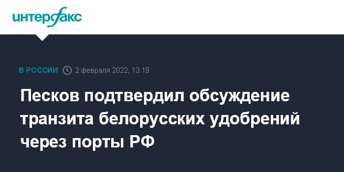 Москва. 2 февраля. INTERFAX.RU - Россия и Белоруссия обсуждают возможность переориентировки транзита белорусских калийных удобрений из литовского порта Клайпеды в российские порты, заявил пресс-секретарь президента Путина Дмитрий Песков.