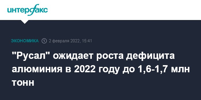 Москва. 2 февраля. INTERFAX.RU - Глобальный дефицит алюминия в 2022 году может составить 1,6-1,7 млн тонн, говорится в обзоре BCS по итогам встречи с представителями "Русала".