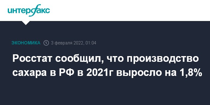 Росстат сообщил, что производство сахара в РФ в 2021г выросло на 1,8%
