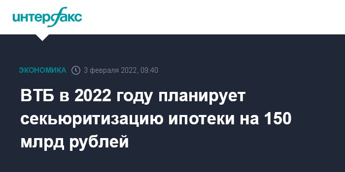 ВТБ в 2022 году планирует секьюритизацию ипотеки на 150 млрд рублей