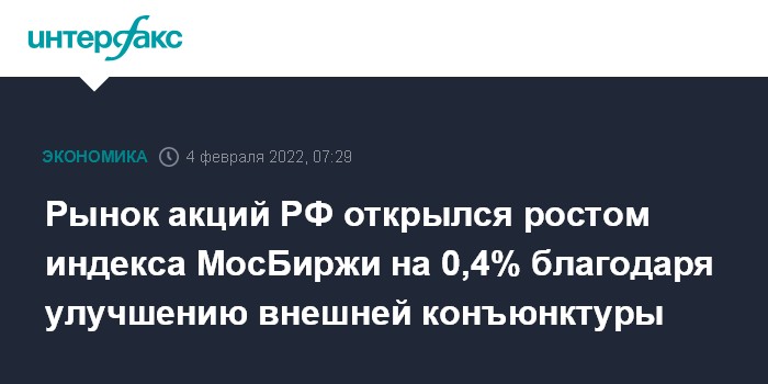 Рынок акций РФ открылся ростом индекса МосБиржи на 0,4% благодаря улучшению внешней конъюнктуры