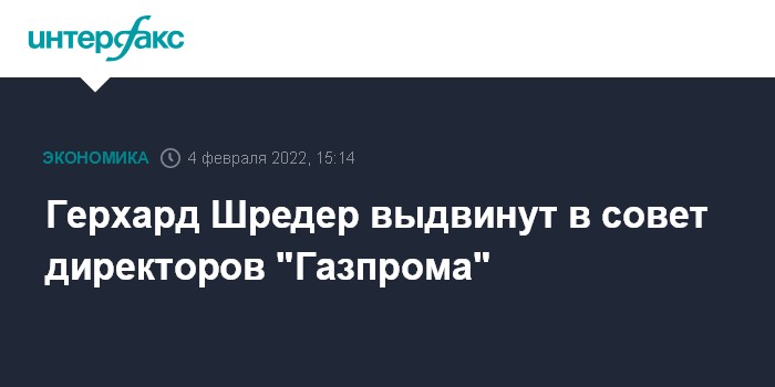 Москва. 4 февраля. INTERFAX.RU - Бывший канцлер Германии, председатель комитета акционеров компании Nord Stream AG Герхард Шредер выдвинут в совет директоров "Газпрома" для переизбрания на годовом собрании, сообщила компания.