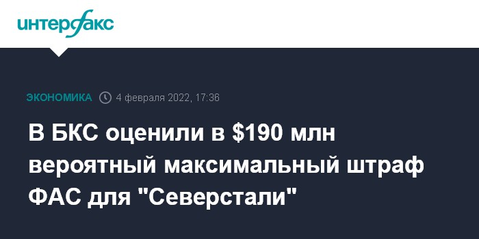 Москва. 4 февраля. INTERFAX.RU - Максимальный штраф по итогам расследования в отношении "Северстали" о признаках установления и поддержания монопольно высокой цены на горячекатаный прокат, которое проводит Федеральная антимонопольная служба (ФАС) РФ, может составить приблизительно $190 млн. Такие оценки приводят аналитики БКС (BCS GM) в обзоре по итогам встречи с представителями отдела IR компании.