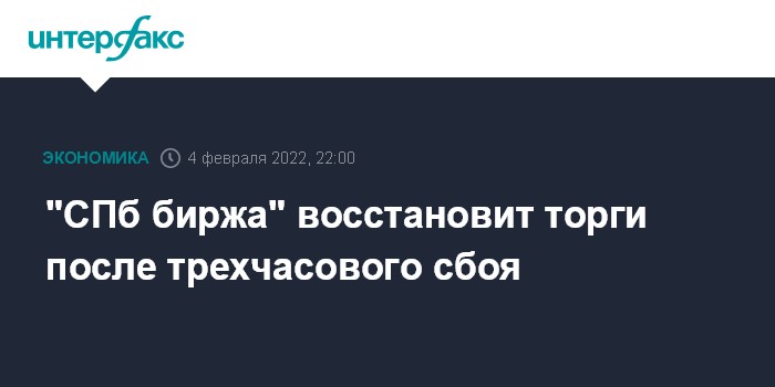 Москва. 4 февраля. INTERFAX.RU - "СПб биржа" сообщила, что восстановит торги в 22:00 после трехчасового сбоя.