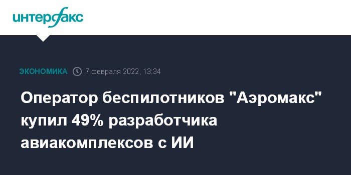 Оператор беспилотников "Аэромакс" купил 49% разработчика авиакомплексов с ИИ