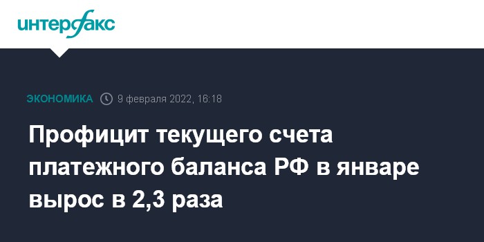 Москва. 9 февраля. INTERFAX.RU - Положительное сальдо текущего счета платежного баланса РФ в январе 2022 года, по предварительной оценке, увеличилось в 2,3 раза, до $19 млрд, по сравнению с январем 2021 года, когда оно составило $8,1 млрд, сообщается в информации на сайте ЦБ РФ.