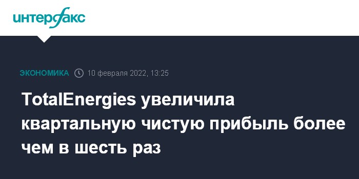 Москва. 10 февраля. INTERFAX.RU - Французская нефтегазовая компания TotalEnergies SE (ранее Total) в четвертом квартале 2021 года увеличила чистую прибыль более чем в 6 раз, до $5,84 млрд на фоне роста цен на энергоносители. В октябре-декабре 2020 года показатель составил $891 млн.