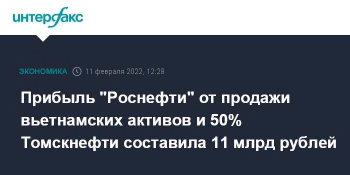 Москва. 11 февраля. INTERFAX.RU - "Роснефть" в третьем квартале 2021 года закрыла сделки по продаже инвестиции в 50% акций АО "Томскнефть", которая ранее учитывалась как участие в совместных операциях, и 100% долей в капитале дочерних обществ, основной деятельностью которых было участие в совместных операциях по добыче и транспортировке газа во Вьетнаме.