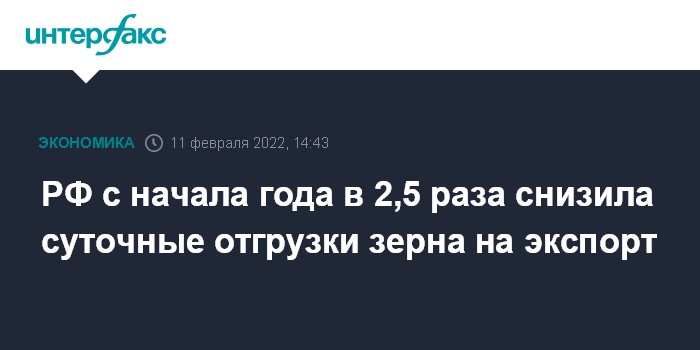 Москва. 11 февраля. INTERFAX.RU - РФ с начала года резко снизила суточные отгрузки зерна на экспорт, сокращается число компаний-экспортеров, конкурентоспособность российской продукции падает, следует из мониторинга Российского зернового союза.