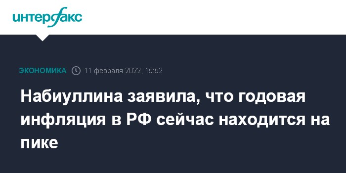 Москва. 11 февраля. INTERFAX.RU - Годовая инфляция в РФ сейчас находится на пиковых значениях, ее замедление ожидается в конце первого, во втором квартале, заявила председатель Банка России Эльвира Набиуллина на брифинге в пятницу.