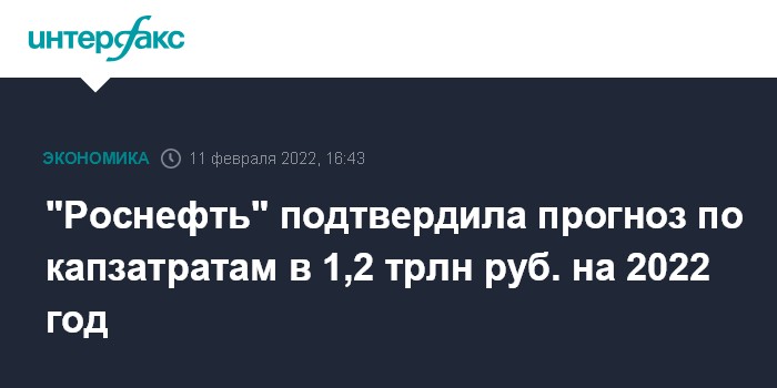 Москва. 11 февраля. INTERFAX.RU - "Роснефть" подтвердила прогноз по капитальным затратам на 1,2 трлн рублей ($16,2 млрд) на 2022 год, сообщает "ВТБ Капитал" по итогам встреч инвесторов с представителями компании в рамках форума "Россия зовет!".