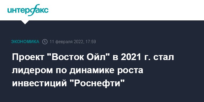 Москва. 11 февраля. INTERFAX.RU - Проект "Роснефти" "Восток Ойл" в 2021 году стал лидером по динамике роста инвестиций среди других предприятий компании.