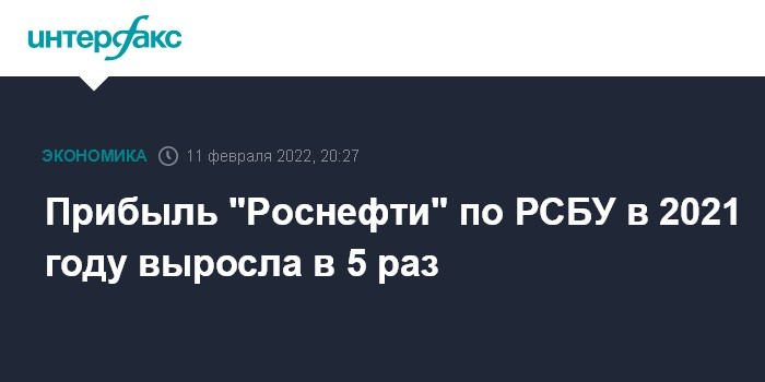 Москва. 11 февраля. INTERFAX.RU - Чистая прибыль "Роснефти" по РСБУ в 2021 году выросла в 5 раз, до 602,9 млрд руб., следует из отчета компании.