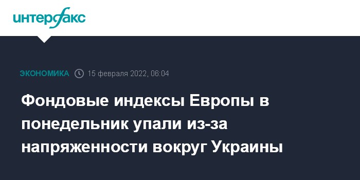 Москва. 15 февраля. INTERFAX.RU - Европейские рынки акций резко снизились по итогам торгов в понедельник из-за возросшей напряженности вокруг Украины.