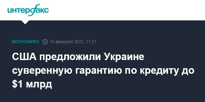 Москва. 15 февраля. INTERFAX.RU - Правительство США предлагает Украине суверенную гарантию по кредиту на сумму до $1 млрд для поддержки ее программы экономических реформ и продолжения взаимодействия с Международным валютным фондом (МВФ). Об этом говорится в заявлении госсекретаря США Энтони Блинкена на сайте Госдепа.