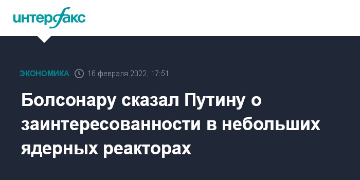Москва. 16 февраля. INTERFAX.RU - Бразилия заинтересована в строительстве на ее территории небольших ядерных реакторов, сообщил президент страны Жаир Болсонару по итогам переговоров с российским президентом Владимиром Путиным.