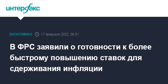 Москва. 17 февраля. INTERFAX.RU - Руководители Федеральной резервной системы (ФРС) открыты для более быстрого повышения процентных ставок в течение этого года, а также готовы предпринять другие меры ужесточения денежно-кредитной политики, если инфляция будет оставаться на высоком уровне, свидетельствует протокол проходившего 25-26 января заседания.