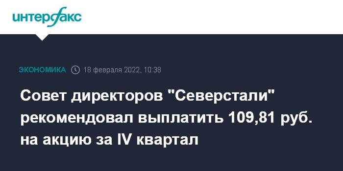 Москва. 18 февраля. INTERFAX.RU - Совет директоров "Северстали" рекомендовал дивиденды за IV квартал 2021 года в размере 109,81 руб. на акцию, сообщила компания.