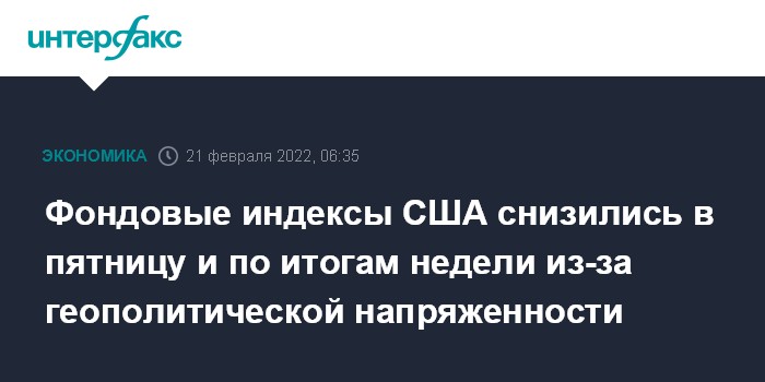Москва. 21 февраля. INTERFAX.RU - Американские фондовые индексы завершили в минусе торги в пятницу и снизились по итогам второй недели подряд на опасениях разрастания конфликта вокруг Украины.