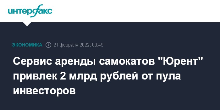 Москва. 21 февраля. INTERFAX.RU - Сервис аренды самокатов "Юрент" сообщил, что привлек 2,09 млрд рублей инвестиций.