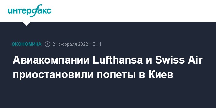 Москва. 21 февраля. INTERFAX.RU - Немецкая авиакомпания Lufthansa и швейцарская Swiss Air с понедельника приостанавливают полеты в Киев на фоне сложной ситуации вокруг Украины, сообщает BBC News.
