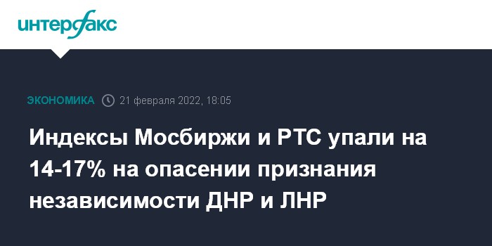 Индексы Мосбиржи и РТС упали на 14-17% на опасении признания независимости ДНР и ЛНР