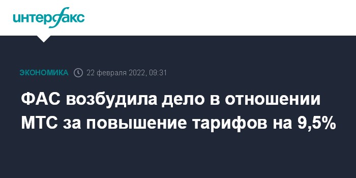 Москва. 22 февраля. INTERFAX.RU - Федеральная антимонопольная служба, сообщила, что возбудила дело в отношении ПАО "МТС" за повышение стоимости услуг в январе в среднем на 9,5%. Это повышение в ФАС считают необоснованным.