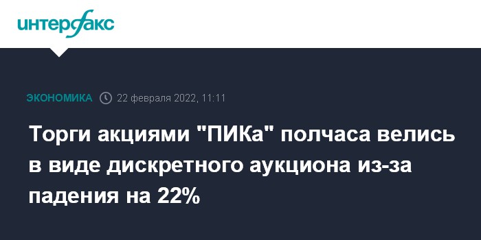 Торги акциями "ПИКа" полчаса велись в виде дискретного аукциона из-за падения на 22%