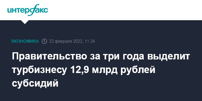 Москва. 22 февраля. INTERFAX.RU - В ближайшие три года из федерального бюджета будет выделено 12,9 млрд рублей на выплату субсидий представителям туристического бизнеса. Как сообщила пресс-служба правительства, такие изменения внес в программу по развитию туризма и утвердил премьер-министр Михаил Мишустин.