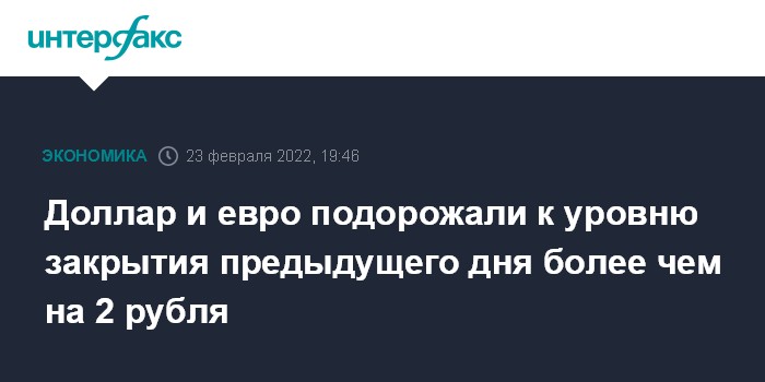 Москва. 23 февраля. INTERFAX.RU - Доллар США и евро заметно дорожают на Московской бирже в среду вечером; рубль усилил падение к бивалютной корзине и обновил минимумы предыдущего дня, отыгрывая возросшие геополитические и санкционные риски после признания Россией независимости Донецкой и Луганской народных республик (ДНР и ЛНР).