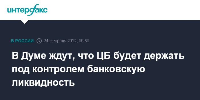 "Я думаю, что банкам надо работать в прежнем режиме, оказывать весь перечень услуг. ЦБ, я уверен, держит ситуацию на контроле и все, что необходимо для поддержания ликвидности, поддержания стабильности работы он сделает", - сказал Аксаков, комментируя ситуацию в связи с началом военной операции на Украине.