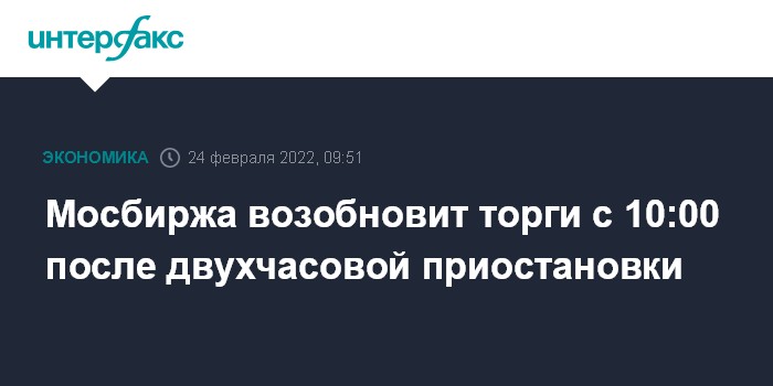 Москва. 24 февраля. INTERFAX.RU - "Московская биржа" возобновит торги с 10:00, говорится в сообщении биржи.