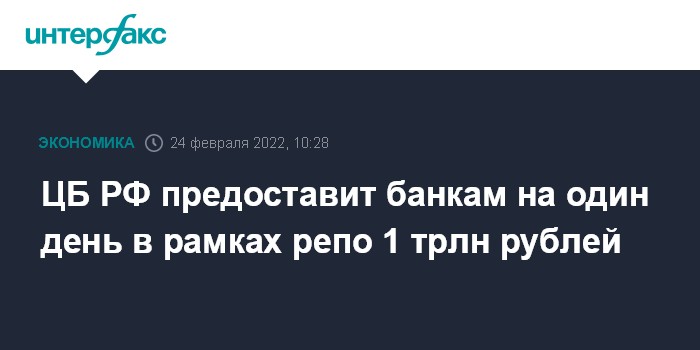 ЦБ РФ предоставит банкам на один день в рамках репо 1 трлн рублей