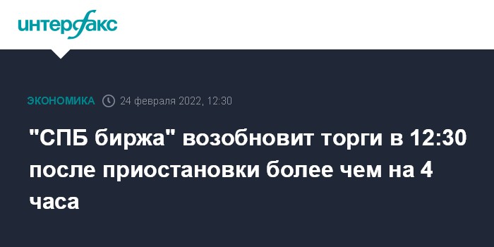 Москва. 24 февраля. INTERFAX.RU - "СПБ биржа" возобновляет торги с 12:30 по московскому времени.