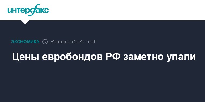 Москва. 24 февраля. INTERFAX.RU - Цены российских суверенных еврооблигаций заметно упали в четверг днем, отыгрывая геополитические и санкционные риски после начала боевых действий в Донбассе; среднесрочные и "длинные" выпуски евробондов РФ подешевели до 50-70% от номинала, их доходности выросли до 8-16% годовых. При этом самые "короткие" выпуски евробондов РФ немного выросли в цене.