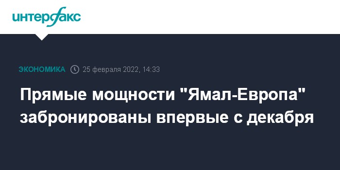 Москва. 25 февраля. INTERFAX.RU - Прямые мощности газопровода "Ямал-Европа" впервые с декабря забронированы на часть газовых суток 25 февраля, свидетельствуют итоги внутридневного аукциона на платформе GSA Platform.