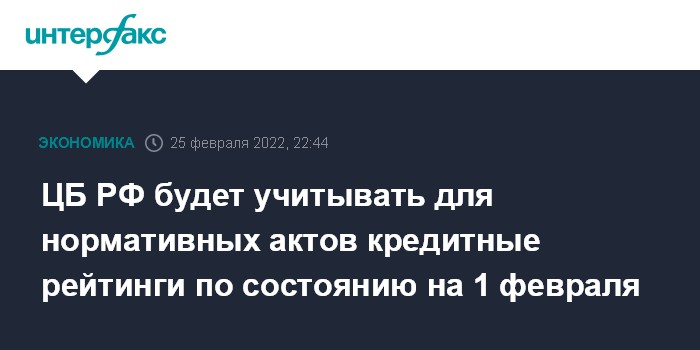 Москва. 25 февраля. INTERFAX.RU - Совет директоров Банка России принял решение зафиксировать рейтинги кредитоспособности, присвоенные рейтинговыми агентствами S&P, Fitch и Moody's, при применении нормативных актов ЦБ по состоянию на 1 февраля 2022 года, говорится в сообщении регулятора.
