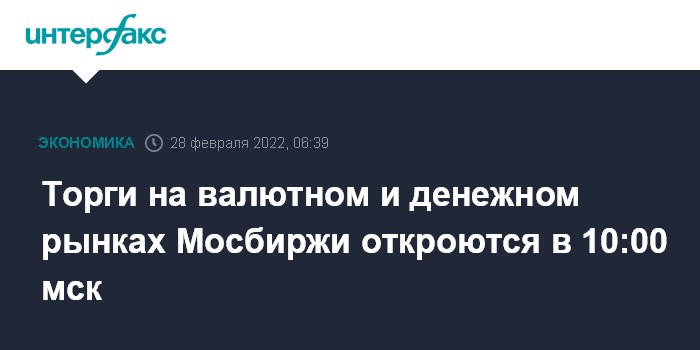 Москва. 28 февраля. INTERFAX.RU - Торги на валютном и денежном рынках "Московской биржи" в понедельник откроются в 10:00 по московскому времени в соответствии с решением Банка России, говорится в сообщении "Мосбиржи".