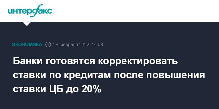 Москва. 28 февраля. INTERFAX.RU - Российские банки готовятся корректировать ставки по кредитным и депозитным продуктам после резкого повышения ключевой ставки Банка России до 20% годовых, о пересмотре ставок по уже выданным кредитам речь не идет.