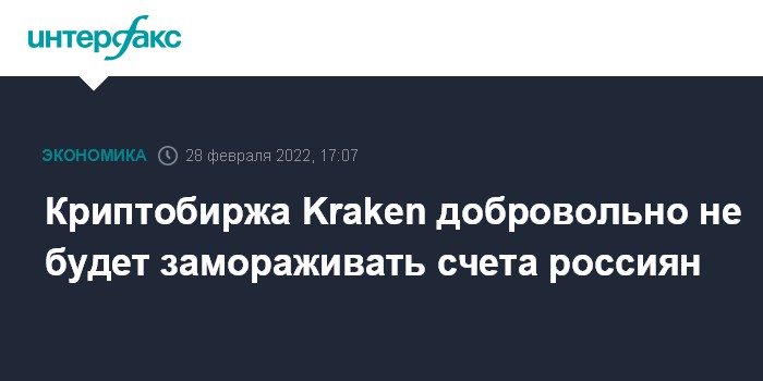 Москва. 28 февраля. INTERFAX.RU - Зарегистрированная в США криптобиржа Kraken, входящая с ТОП-5 мировых криптовалютных бирж по суточному объему торгов, не планирует добровольно замораживать счета российских клиентов, но может сделать это, если получит соответствующие юридические требования.