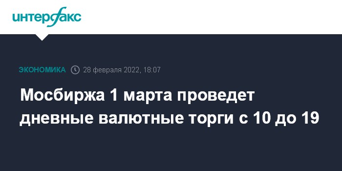 Во вторник, 1 марта торги на валютном и денежном рынках биржи будут проходить с 10:00 до 19:00.
