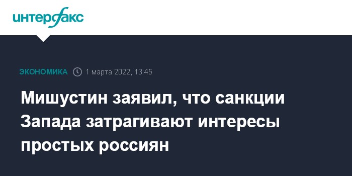 Москва. 1 марта. INTERFAX.RU - США и ЕС перешли от санкционного преследования отдельных политиков и компаний к ограничениям, затрагивающим интересы простых россиян, заявил премьер РФ Михаил Мишустин.
