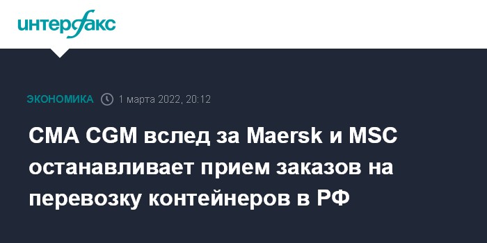 Москва. 1 марта. INTERFAX.RU - Французская контейнерная линия CMA CGM с 1 марта остановила прием заявок на перевозку контейнеров в и из России, сообщила компания.