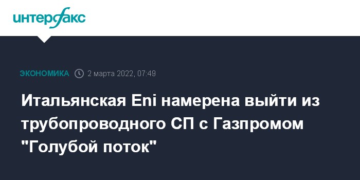 Москва. 2 марта. INTERFAX.RU - Итальянская Eni намерена выйти из совместного предприятия с "Газпромом", которое владеет газопроводом из России в Турцию, "Голубой поток", сообщает агентство ANSA со ссылкой на представителя компании.