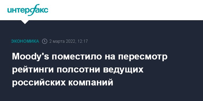Москва. 2 марта. INTERFAX.RU - Международное рейтинговое агентство Moody's Investors Services в среду поместило в список на пересмотр с возможностью снижения рейтинги 51 российской компании вслед за аналогичным действием в отношении суверенного рейтинга РФ.