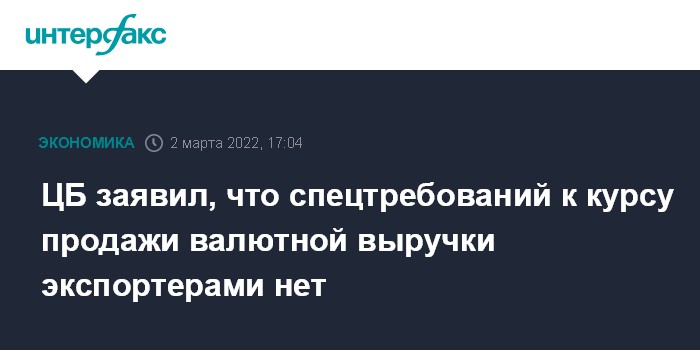 Москва. 2 марта. INTERFAX.RU - Специальных требований к курсу обязательной продажи валютной выручки экспортерами нет, сейчас она осуществляется по рыночному курсу, говорится в разъяснениях, опубликованных Центробанком.