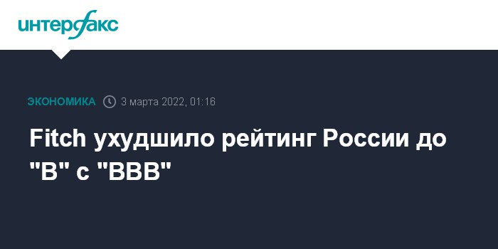 Москва. 3 марта. INTERFAX.RU - Международное рейтинговое агентство Fitch Ratings снизило долгосрочный рейтинг дефолта эмитента в иностранной валюте России до "В" с "ВВВ".