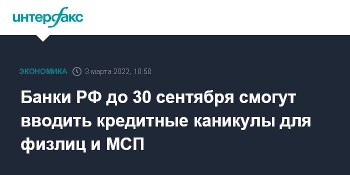 Москва. 3 марта. INTERFAX.RU - Банки РФ до 30 сентября 2022 года смогут вводить кредитные каникулы для розничных заемщиков и клиентов МСП, соответствующий законопроект правительство РФ внесло в Госдуму в четверг.