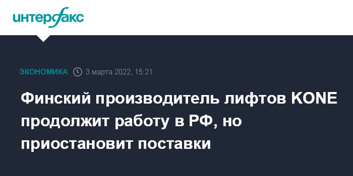 "Ведущий мировой производитель лифтового и подъемного оборудования KONE (Финляндия) остается на российском рынке, но предупреждает своих клиентов в России о временном прекращении поставок. Когда поставки будут возобновлены, поступит отдельная коммуникация клиентам", - сообщили в компании.