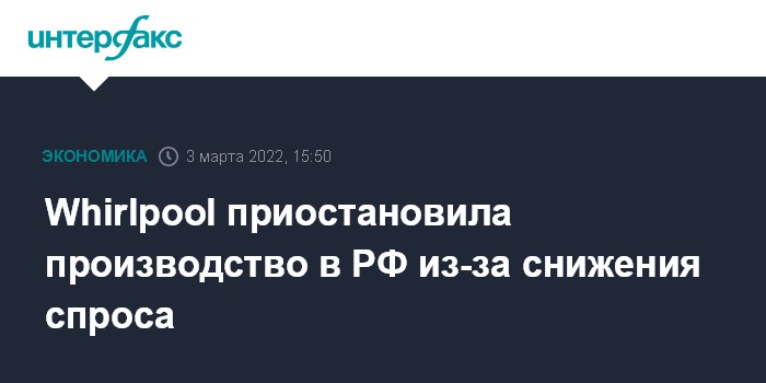 Москва. 3 марта. INTERFAX.RU - Американская Whirlpool Corp, которая производит в России холодильники и стиральные машины на двух заводах в Липецке, приостановила производство на этих площадках, говорится в сообщении на инвестиционном портале региона.